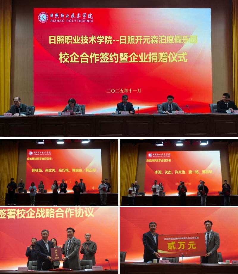 本次签约与捐赠仪式,标志着我校与日照开元森泊度假乐园的校企合作迈入了战略协同、共谋长远的新阶段。双方将以此次合作为契机,携手构建产教深度融合、良性互动的发展新格局,共同将合作成果转化为服务区域发展大局的强劲动能,为日照市乃至更广区域的文旅产业升级与经济社会发展,贡献卓越的教育力量与产业智慧。(人文与旅游系 徐伟莲 谢慧)